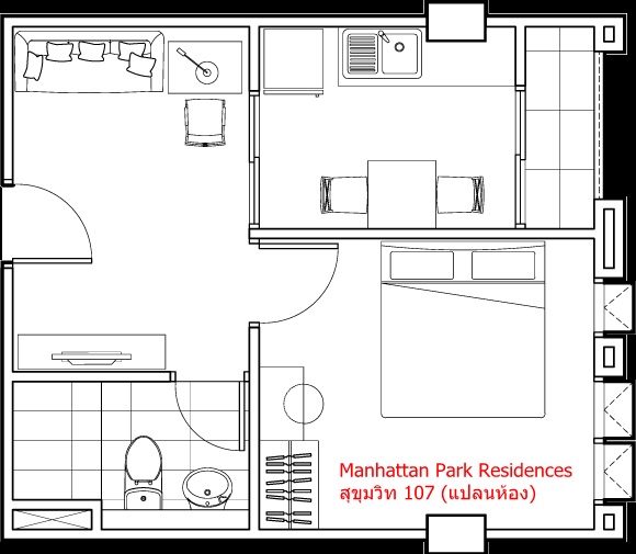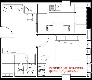 คอนโดน่าอยู่ใกล้ BTS แบริ่ง Manhattan Park สุขุมวิท 107 ห้อง 206 ริมสระน้ำ 31 ตร.ม. 1นอน 1น้ำ เดินทางสะดวก
