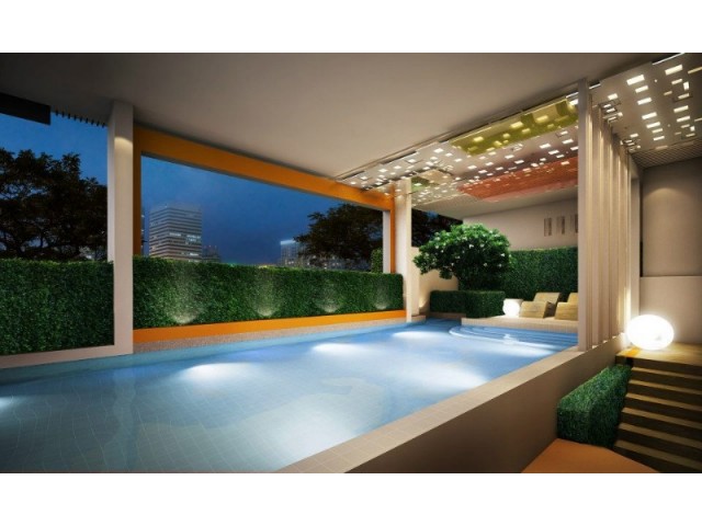 ระเบียงหันไปทางทิศเหนือ มีความเป็นส่วนตัวเพราะหน้าห้องเป็นโถงกว้างมีส่วนหย่อมและสิ่งอำนวยความสะดวกเช่นสระว่ายน้ำและFitness ซึ่งอยู่ในบริเวณโถงชั้น 2