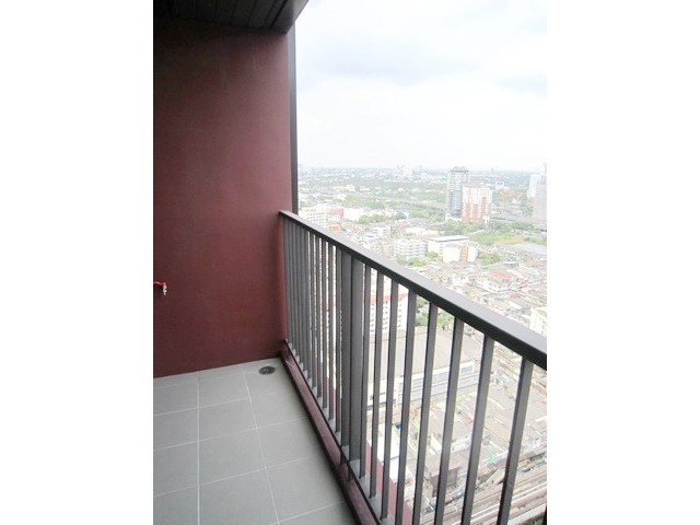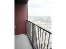 ระเบียงกว้างพร้อมรับวิวเมือง บนชั้น 26 เฟอร์นิเจอร์มีโซฟา ทีวี ครัว L shape เหมาะทำอาหารหนัก พร้อมปล่องควัน