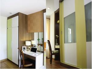 ห้องตกแต่งบิวท์อิน แนวโมเดิร์นทั้งห้อง ภายนอกห้องนอนปูพื้นด้วยแกรนิตโต้ ส่วนห้องนอนเป็นพื้นลามิเนท