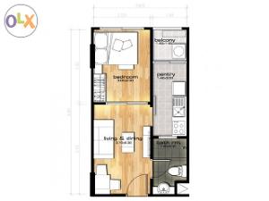 ห้องนั่งเล่น + ห้องนอน + ห้องน้ำ + ห้องครัว + พร้อมฉากกั้น ห้องนอน ห้องครัว และระเบียง