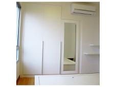 - ห้องนอน เตียงนอนขนาด 5 ฟุต, แอร์, ตู้เสื้อผ้า, ชั้นไม้และกระจกเงา