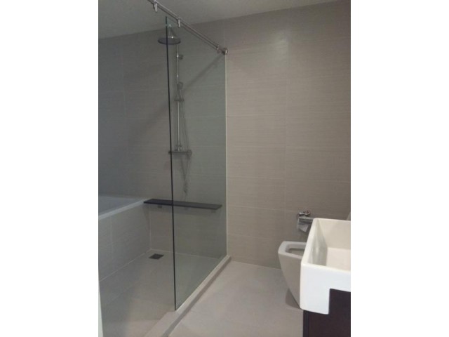 •ห้องน้ำกั้นด้วยกระจกลามิเนต มีบริเวณเปลี่ยนเสื้อผ้า