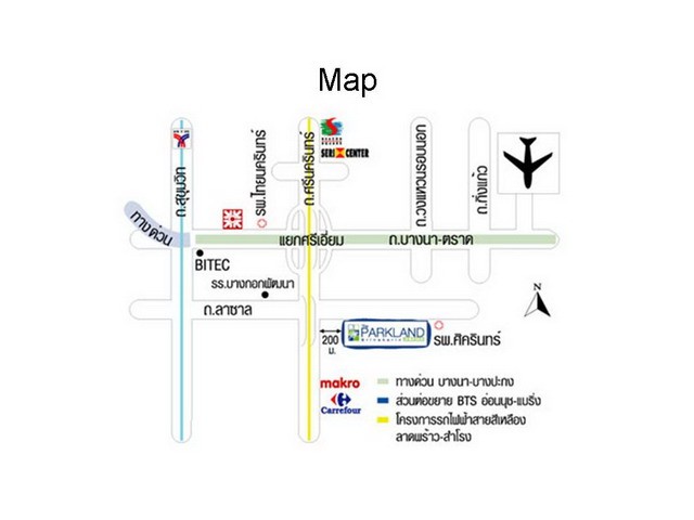 Project area : Srinakarin Rd., nearly Central Bangna, Carrefour, Bangkok Pattana International school and vans from Parkland Condo to BTS. The inside of the project, over 6 Rai of the area is allocated to be the area for garden, lake, large size swimming pool, jogging track around the garden.