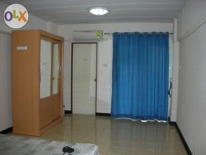 - ห้องขนาด 25 ตรม.พื้นกระเบื่อง ผนังวอลเปเปอร์ แอร์ ตู้เสื้อผ้า เตียงนอน ผ้าม่าน