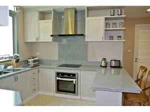 ห้องครัว มีเตาไฟฟ้า เตาอบ เครื่องดูดควัน ซิ้งค์ล้างจาน หม้อหุงข้าว เครื่องปิ้งขนมปัง กาต้มน้ำไฟฟ้า ตู้เย็น ไมโครเวฟ เครื่องทำวอฟเฟิล เครื่องปั่นอาหาร เครื่องครัวต่างๆ ทั้ง หม้อ กะทะ จาน ชาม ถ้วย ทัพพี ช้อนส้อม มีดพร้อมที่เก็บ ขวดโหล เหยือก ถ้วยกาแฟ ที่รองแก้ว ที่เปิดไวน์ ตะเกียบ พลาสติกรองจาน ผ้ากันเปื้อน ถุงมือจับของร้อน ครบครัน ตู้ที่เก็บของเครื่องใช้ในครัว เคาเตอร์และเก้าอี้สำหรับนั่งรับประทานอาหารอีก 2 ตัว และเครื่องซักผ้าแยกส่วนมาไว้ด้านข้างพร้อมประตูปิดเปิด