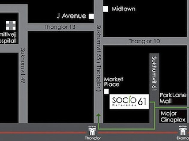 ฝั่งทิศเหนือของโครงการฯ จะได้รับ Greenery View แบบเต็มๆ อากาศคงจะสดชื่นอย่างแน่นอน และ ซอยสุขุมวิท 61 นี้เป็นซอยที่สะอาด ร่มรื่น อีกทั้งเป็นซอยตัวอย่างของ กทม ระยะทาง 200 เมตร จากปากซอย ถึง คอนโด Socio และ 100 เมตร จาก BTS เอกมัย ใกล้ๆ Major Cineplax และ ศุนย์การค้า Gateway โดยทางโครงการฯ มีรถกอล์ฟรับส่งถึงหน้าปากซอยสุขุมวิท