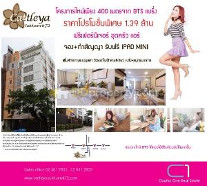 คอนโดใหม่เพียง 400 เมตรจาก BTS แบริ่ง!!!! Cattleya Sukhumvit 72 พร้อมเข้าอยู่ โครงการ Cattleya Sukhumvit 72 คอนโดใหม่ซึ่งตั้งอยู่บนถนนสุขุมวิท เดินทางสะดวกสบาย ใกล้ BTS สถานี แบริ่ง ทำให้การเดินทางของคุณสู่ที่หมายรวดเร็วขึ้น ราคาโปรโมชั่นพิเศษ 1.39 ล้านบาท จอง 5,000 ทำสัญญา 20,000 บาท จอง + ทำสัญญา รับฟรี IPAD MINI จำนวนจำกัด - ฟรี เฟอร์นิเจอร์ - ฟรี ชุดครัว - ฟรี แอร์ ชื่อโครงการ Cattleya Sukhumvit 72 ที่ตั้ง ซอยสุขุมวิท 72 (ศิริคาม 4 ) 400 เมตร จาก BTS แบริ่ง ผู้บริหารงานขาย บริษัท แคปปิตอล วัน เรียลเอสเตท ลักษณะโครงการ อาคารพักอาศัยสูง 8 ชั้น , ชั้น 1 : ที่จอดรถ ล็อบบี้ ชั้น 2-8 : ส่วนพักอาศัย ชั้นดาดฟ้า : ห้อง fitness สวนลอยฟ้า โครงการของเราตั้งอยู่ใกล้สิ่งอำนวยความสะดวกมากมาย เพียง 5 นาที จาก BTS สถานีแบริ่ง ,ทางด่วน บางนา – ดินแดง และใกล้ศูนย์การค้าชั้นนำต่างๆ อาทิเช่น Central Bangna, Terminal 21, Paragon, Siam เป็นต้น ง่ายต่อการเข้าออกทั้งโดยรถยนต์ ใกล้ทางด่วนและรถไฟฟ้า โครงสร้างของอาคารประกอบไปด้วย อาคาร มีความสูงทั้งหมด 8 ทั้งหมด 69 ยูนิต ระบบการรักษาความปลอดภัยเข้าออกโดย Access card ยามรักษาความปลอดภัย 24 ชั่วโมง โครงการสงวนสิทธิ์ในการเปลี่ยนแปลงรายละเอียดโดยไม่ต้องแจ้งให้ทราบล่วงหน้า Sales Office 02-361-7801 , 02-611-2900 , 080-939-3932