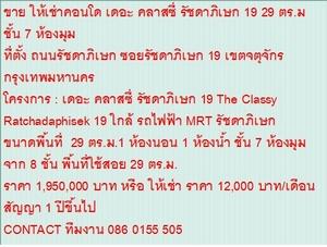ขาย ให้เช่าคอนโด The Classy รัชดาภิเษก 19 29 ตร.ม ชั้น 7 ห้องมุม