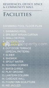 - ส่วนกลาง สระว่ายน้ำ, สปาน้ำ, สไลเดอร์เล่นน้ำ, สวนทำบาร์บีคิว, สวนเด็กเล่น, จากุ๊ดซี่เด็ก, ซาวน่า, ฟิตเนส, สวนลอยฟ้า