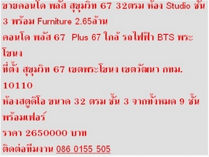 ไม่รับนายหน้าทุกรณี ขาย คอนโด Plus 67 32 ตารางเมตร พร้อมเฟอร์ สวย 1 BEDROOM 2.65 ล้าน / ขาย คอนโด Plus 67 32 ตารางเมตร พร้อมเฟอร์ สวย 1 BE รายละเอียดห้องและคอนโด ขายคอนโด พลัส สุขุมวิท 67 32ตรม ห้อง Studio ชั้น 3 พร้อม Furniture 2.65ล้าน คอนโด พลัส 67 Plus 67 ใกล้ รถไฟฟ้า BTS พระโขนง ที่ตั้ง สุขุมวิท 67 เขตพระโขนง เขตวัฒนา กทม. 10110 ห้องสตูดิโอ ขนาด 32 ตรม ชั้น 3 จากทั้งหมด 9 ชั้น พร้อมเฟอร์ ราคา 2650000 บาท ขายคอนโด Plus 67 ห้องสตูดิโอ ขนาด32 ตรม. สุขุมวิท 67 ใกล้ BTS พระโขนง ที่ตั้ง สุขุมวิท 67 เขตพระโขนง เขตวัฒนา กทม. 10110 คอนโด Plus 67 สภาพดี ขนาด32 ตรม. ชั้น 3 จากทั้งหมด 9 ชั้น พร้อมเฟอร์นิเจอร์บิ้วอิน แอร์ไดกิ้น(เพิ่งเปลี่ยนใหม่)+ ตู้เย็น + ไมโครเวฟ + ทีวี เดินเพียง 5 นาทีจาก BTS พระโขนง มีสระว่ายน้ำ Fitness Keycard ที่จอดรถ เงียบสงบ มีความเป็นส่วนตัวเพราะเป็นคอนโดขนาดเล็ก สถานที่ใกล้เคียง -รถไฟฟ้า BTS สถานีพระโขนง -gateway -ดิ เอ็ม โพเรี่ยม -Major สุขุมวิท -โรงพยาบาลสุขุมวิท -สถานีขนส่งเอกมัย -ทางด่วนเอกมัย สิ่งอำนวยความสะดวก - ฟิตเนส - สระว่ายน้ำ - Key card - กล้องวงจรปิด - รปภ. 24 ชม. - ที่จอดรถ ราคา 2650000 บาท -สนใจติดต่อ โทร. 086-01555-05 หรือ Line ID: 1pissanuponl ฝ่ายขาย GR PROPERTY -Interested Contact TEL.086-01555-05 Or Line ID: 1pissanuponl ฝ่ายขาย GR PROPERTY รหัสNNC83 (PAT)