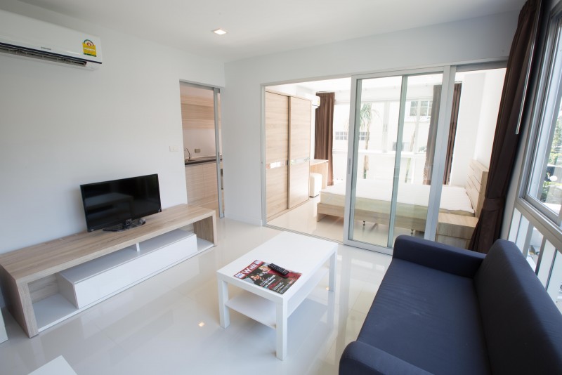 ให้เช่า คอนโด ทีซี กรีน พระราม 9 42 ตรม. ห้องมุม เพดานสูง 2.7 ม. ทำให้ห้องดูโปร่งโล่งสบาย