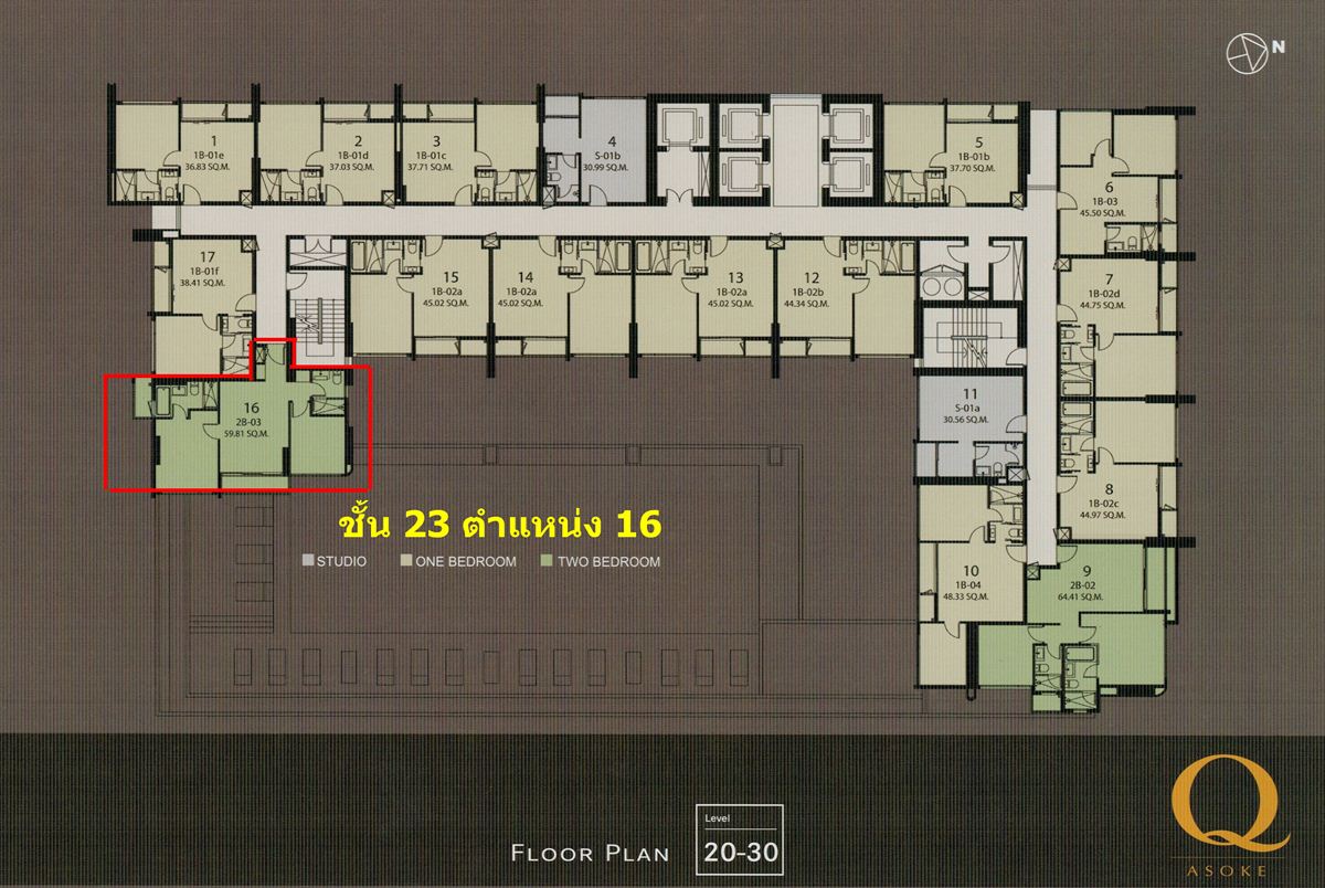 Q Condo Asoke 1 ห้องนอน 44.75 ตรม. ชั้น 23 ราคา 8.3ล้าน