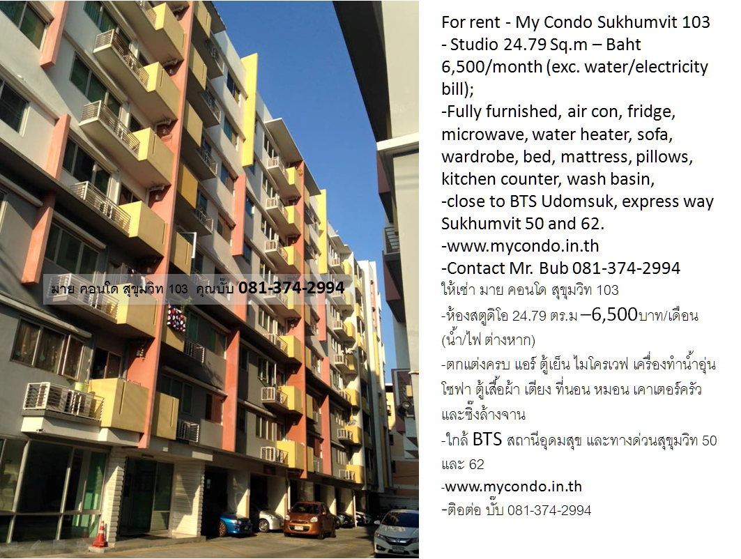 ให้เช่าคอนโดโครงการ My Condo Sukhumvit 103 - 6500 ต่อเดือน ติดต่อคุณ บั๊บ
