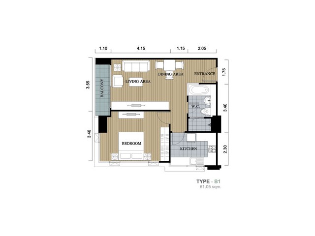 ห้องอยู่ชั้นที่ 15 เป็นห้องขนาด 1 ห้องนอน 59.65 ตาราวเมตร เฟอร์นิเจอร์ตบแต่งพร้อม ให้เช่าราคา 25,000 บาท/เดือน