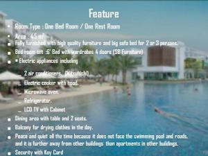 - สิ่งอำนวยความสะดวกภายโครงการ มีร้านอาหารหลากสไตล์ ร้านสะดวกซื้อ ตลอด 24 ชม. ATM ที่จอดรถ สระว่ายน้ำขนาดใหญ่มาก
