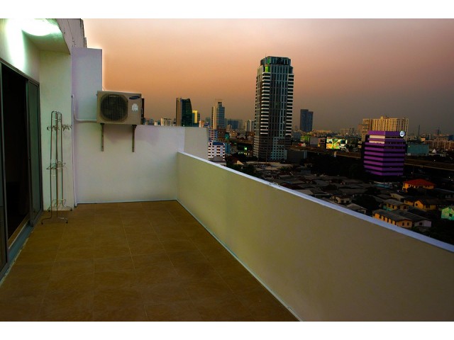 1 ห้องนอน 1 ห้องน้ำ ห้องรับแขก และระเบียงที่กว้างและยาว.