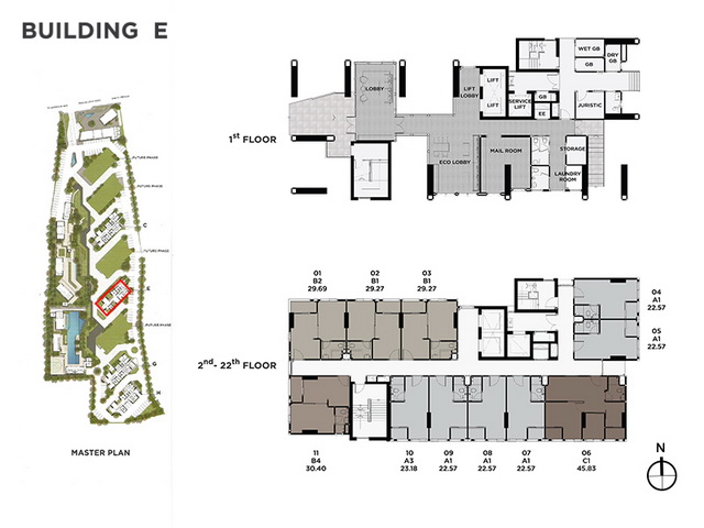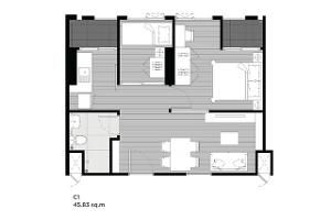 ขนาดห้อง 45.83 ตร.ม. ตึก E ชั้น 11 ทิศตะวันออกเฉียงใต้ (มียูนิตเดียวในแต่ละชั้น)