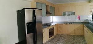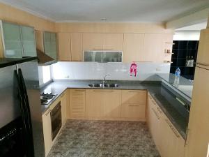 เคาน์เตอร์ครัวแบบบิ้วท์อิน เป็นตัวยู ใหญ่มาก มีเตาไฟฟ้าพร้อมที่ดูดควัน พร้อมตู้แขวนชุดใหญ่