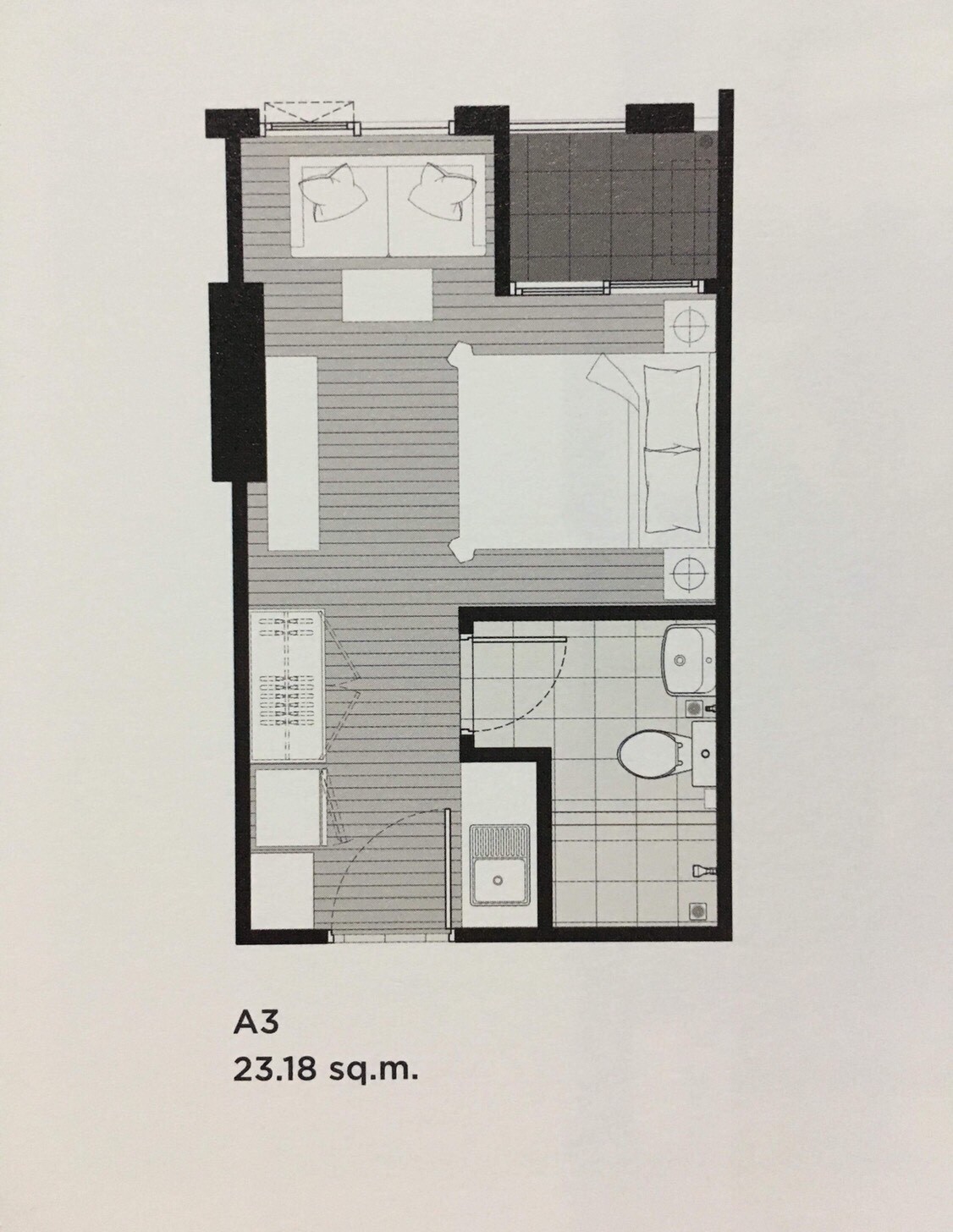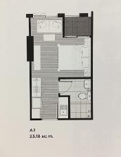 ห้อง Studio ขนาด 23.18 ตร.ม. และเป็นห้องมุม
