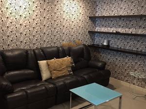 ตู้โชว์ ตู้เก็บของ บิ้วอิน โซฟาหนังปรับเอนนอนได้ขนาด 2.5 เมตร, LCD TV ขนาด 49 นิ้ว โต๊ะกาแฟ,แอร์