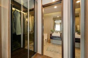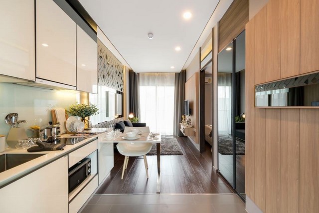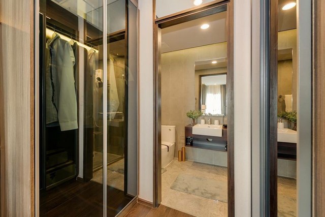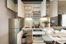 ห้องแบบ Fully Fitted ประกอบด้วย เคาน์เตอร์ครัว ตู้เสื้อผ้า แอร์ และสุขภัณฑ์ในห้องน้ำ