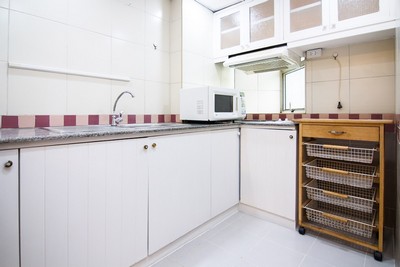 * Open Kitchen – furnished with fridge, electric hot plates and exhaust hood, microwave, under-counter sink and kitchen cabinets