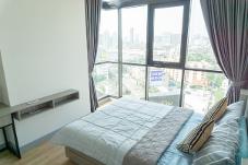 ห้องนอนใหญ่รับวิวด้วยกระจกเข้ามุมบานใหญ่ พื้นจรดเพดาน
