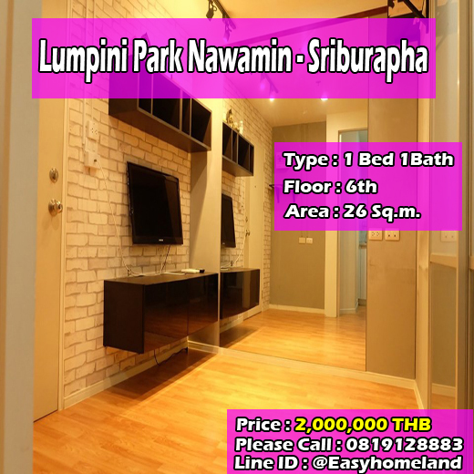 ID 192202 Lumpini Park Nawamin - Sriburapha (ลุมพินี พาร์ค นวมินทร์-ศรีบูรพา) 1 ห้องนอน 1ห้องน้ำ 1 ห้องครัว ขนาด 26 ตร.ม. ชั้น 6 ตกแต่งแบบคลาสสิค ราคา 2,000,000 บาท สนใจติดต่อ 0819128883 Line ID @Easyhomeland ID 192202 Lumpini Park Nawamin - Sriburapha 1 bedroom, 1 bathroom, 1 kitchen Size 26 sq.m., 6th floor Classic decoration Price 2,000,000 baht Please contact 0819128883 Line ID @Easyhomeland รหัส: #02202 ประเภทอสังหาริมทรัพย์: คอนโดมิเนียม ประเภท: ประเภทขาย ลงประกาศเมื่อ: 13/06/2019 12:21:39 ราคา: 2,000,000บาท ลิ้งค์เพิ่มเติม: สถานที่ตั้งทรัพย์สิน ที่อยู่: 55 ถนนนวมินทร์ แขวง นวมินทร์ เขต บึงกุ่ม กรุงเทพมหานคร 10230 อำเภอ/เขต: เขตบึงกุ่ม จังหวัด: กรุงเทพมหานคร ข้อมูลเพิ่มเติม เนื้อที่: 26 ตรว. พื้นที่ใช้สอย: 26 ตรม. ห้องนอน: 1 ห้อง ห้องน้ำ: 1 ห้อง รายละเอียดเพิ่มเติม ที่จอดรถสะดวก รปภ.24 ชม สระว่ายน้ำ ฟิตเนส คีย์การ์ดล็อคชั้น แอร์ 2 ตัว 9,000 btu เครื่องทำน้ำอุ่น 1 เครื่อง ทีวี 32 นิ้ว 1 เครื่อง เตาไฟฟ้า พร้อมที่ดูดควัน เฟอร์นิเจอร์ครบ บิ้วอิ้วทั้งห้อง สถานที่ใกล้เคียง Lumpini Park Nawamin - Sriburapha (ลุมพินี พาร์ค นวมินทร์-ศรีบูรพา) ระยะทาง 1.8 กิโลเมตร หรือประมาณ 6 นาที โดยรถยนต์จาก รัชดาภิเษก ถ้าคุณเดินทางด้วยรถยนต์ ทางด่วนที่ใกล้ที่สุดอยู่ที่ 3.3 กิโลเมตร จากคอนโด URL: http://www.easyhomeland.com/property2.php?h_id=02202