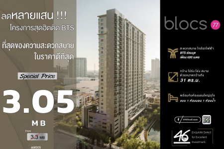 ขาย ห้องแต่งสวย ห้องขนาดใหญ่ 60 ตร.ม. ราคาจับต้องได้ Blocs 77 ใกล้ BTS อ่อนนุช