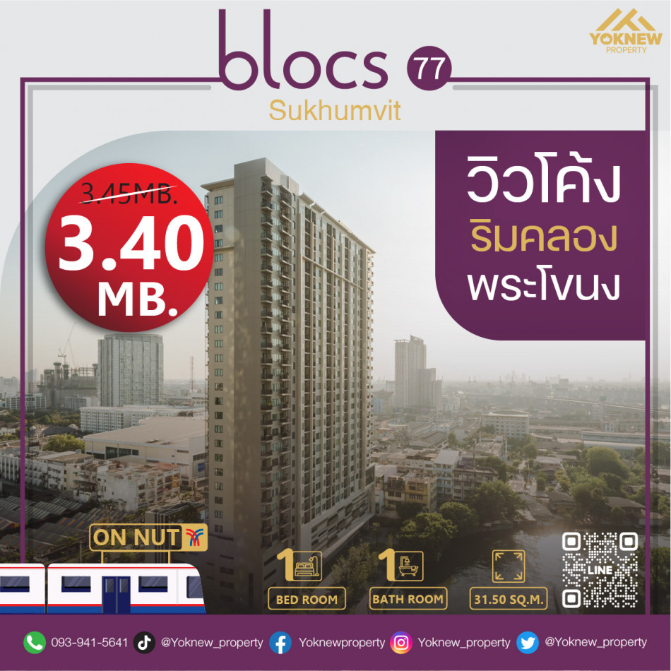 ขายห้อง Size 40 SQ.M ตกแต่งสวยครบทุกอย่าง วิวคลอง คอนโด Blocs 77 ใกล้ BTS อ่อนนุช