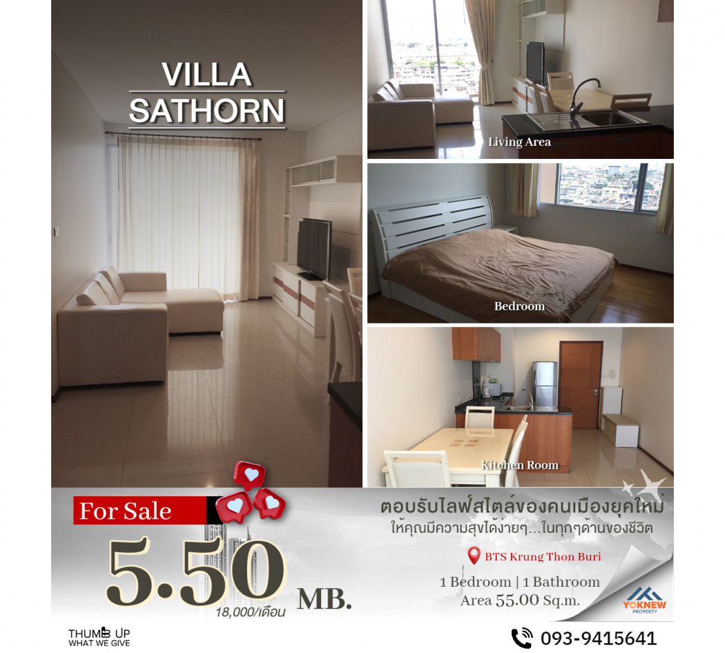 Code C20221204281.......Villa Sathorn สำหรับขาย, 1 ห้องนอน, 1 ห้องน้ำ, ชั้นสูง, แต่งครบ, ราคาพิเศษ!!