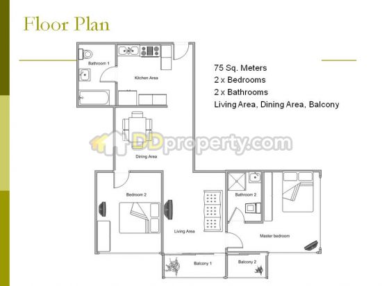ขนาดห้อง: 75 ตารางเมตร 2 ห้องนอน 2 ห้องน้ำ แบ่งส่วนห้องนั่งเล่น ห้องอาหาร และห้องครัว พร้อมระเบียง