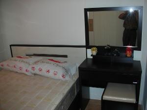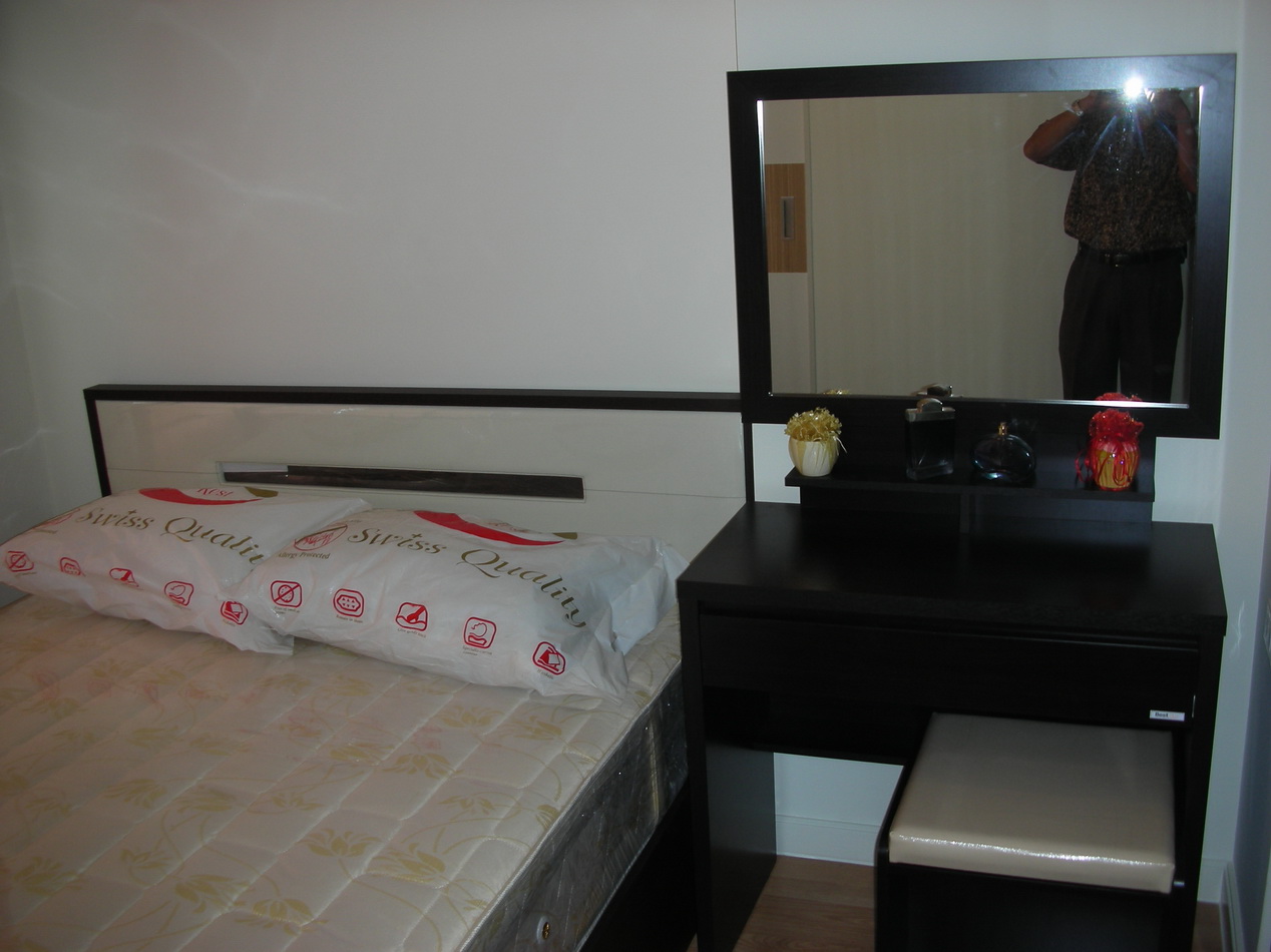 เตียงขนาด 5ฟุต พร้อมที่นอนหนานุ่ม และหมอนหนุน 2 ใบ และโต๊ะเครื่องแป้ง