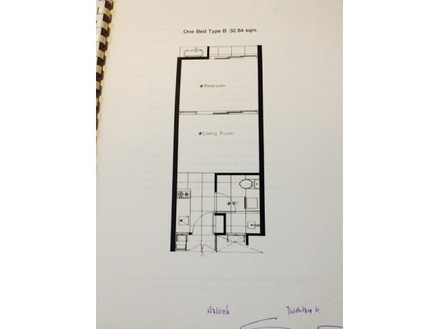 คอนโดห้องชุด 1ห้องนอน เนื้อที่32.84 ตารางเมตร อยู่ชั้น19 ห้องมุมอยู่ใกล้ทางหนีไฟ