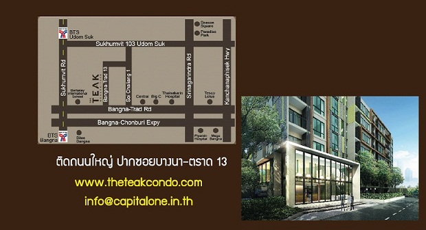 THE TEAK BANGNA-TRAD ที่ตั้งโครงการ : ซอยบางนา-ตราด 13 (ซอยเชลียง 1/1) ถนนบางนา-ตราด (ฝั่งขาออก) กม.2 แขวงบางนา เขตบางนา กรุงเทพมหานคร ห่างจากถนนบางนา-ตราด ประมาณ 20 เมตร ประเภทโครงการ: คอนโดมิเนียม ตกแต่งพร้อมเฟอร์นิเจอร์ สูง 7 ชั้น จำนวน 1 อาคาร เนื้อที่โครงการ: 3 งาน 31 ตารางวา ประเภทห้อง: 1-2 ห้องนอน พื้นที่ใช้สอย: 22.5-75.5 ตารางเมตร จำนวนห้อง: ประมาณ 79 ยูนิต คาดว่าก่อสร้างแล้วเสร็จ: ประมาณ ธันวาคม พ.ศ. 2556 ราคาเริ่มต้น: 1.25 ล้านบาท เจ้าของโครงการ: บริษัท แอล เค เอช ดีเวลลอปเม้นท์ จำกัด ขาย THE TEAK BANGNA-TRAD จองเพียง 5,000บาทเท่านั้น