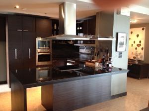  ห้องครัวขนาดใหญ่ ทำใหม่โดยใข้วัสดุพิเศษ พร้อม เตาอบและไมโครเวฟแบบติดผนัง ตู้เย็น และเครื่องล้างจาน